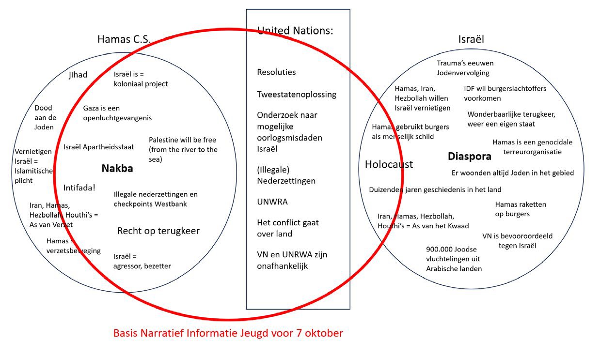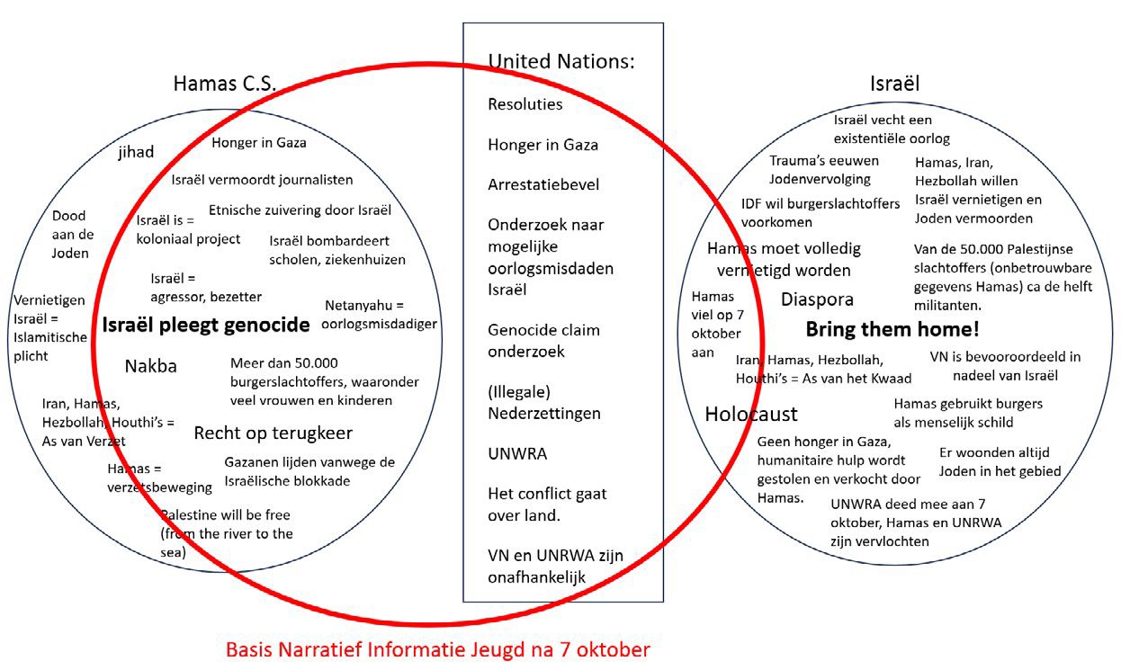 Het resultaat is een narratief waarin Israël altijd de dader is, en de Palestijnen altijd de slachtoffers zijn. Sommige informatie is hierin niet welkom – zie alles wat buiten het rode ovaal blijft – en sommige onjuiste informatie krijgt toch een aureool van geloofwaardigheid. Dat laatste verklaart waarom onwaarheden van Hamas toch binnen de rode lijn vallen. De terroristen van Hamas zijn behendige propagandisten, en zij spelen in op de westerse sentimenten.
